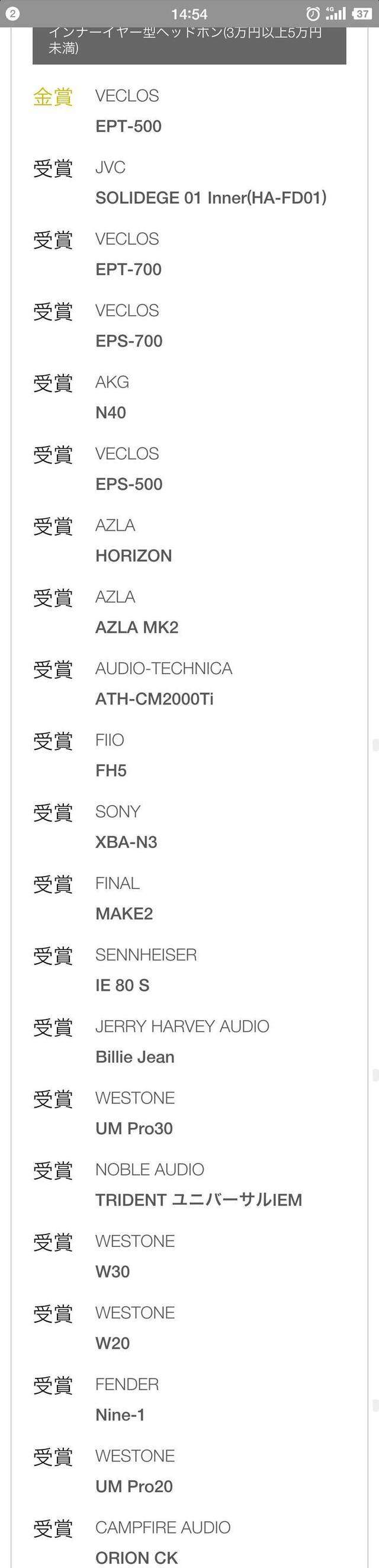 先是网上搜了下,发现竟然在VGP获赏名单中,价格区间3万到5万日元,差不多就是2K-3K价位了,此价位获赏的还有JVC FD01,AKG N40,AZLA HORIZON,SONY N3,IE80S等等,都是比较出名的塞子,见图: