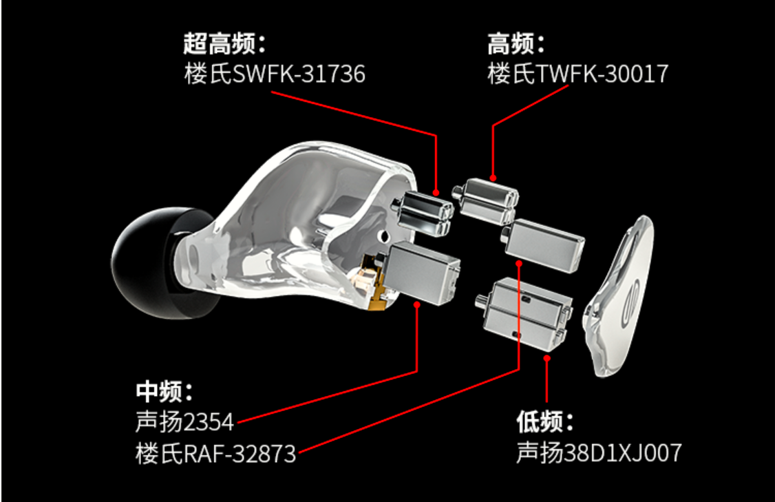 BGVP从DM7开始就采用了娄氏和声扬两家动铁单元组合的配置方案,DM8总共用到了八枚动铁单元其中三枚声扬动铁+五枚娄氏动铁。声扬单元负责中低频,娄氏单元负责中高频,并采用了电子四分频,取两家的优点力求获得最佳的声音。塞子虽然是比较好推的,不需要太过强调前端,但也不能太过随意,最起码还是要配一条带独立解码的小尾巴。