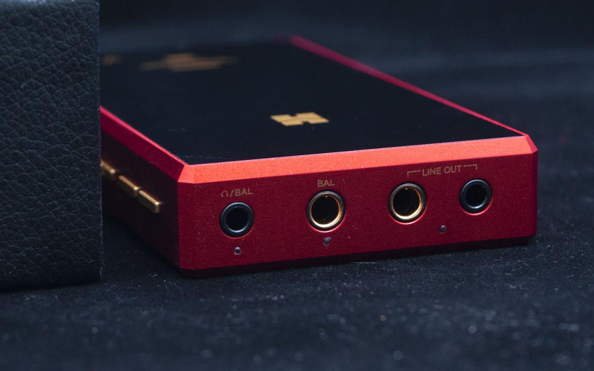 顶部是输出接口,从左到右是3.5mm单端/平衡和4.4mm和LINE OUT(原始信号源,不适合直推耳机)的3.5mm单端与4.4mm平衡输出。