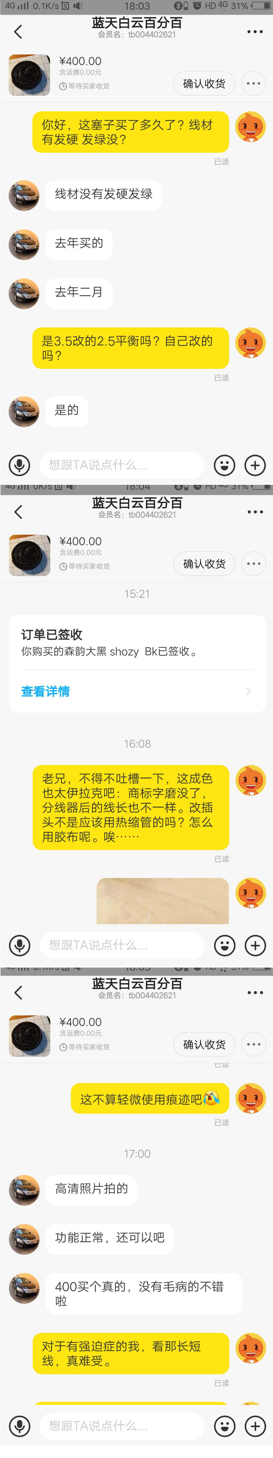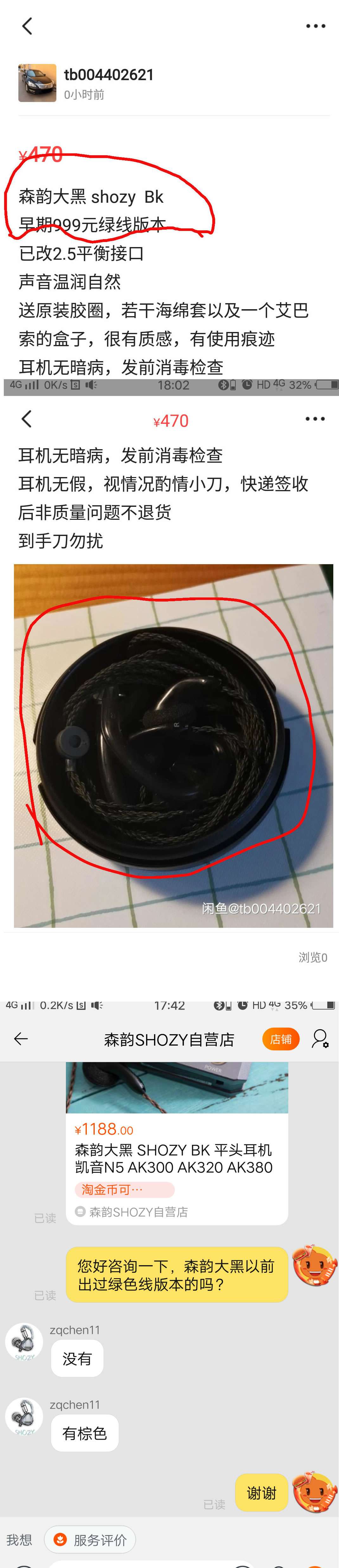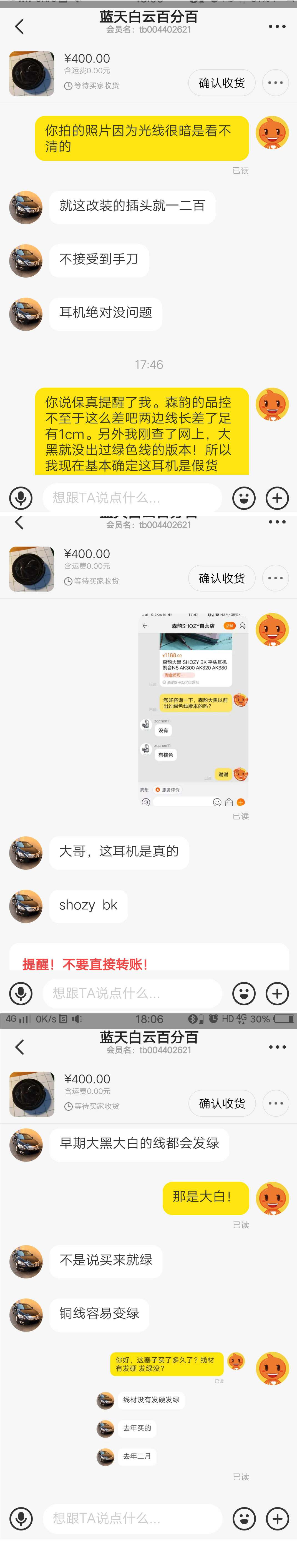 都怪我当初没有查询网络,森韵大黑根本就没有出过什么绿线版本!收到耳塞后发现耳塞上没有森韵标志,分线器出来的两根线长度相差了1cm多,线的颜色也是很奇怪的绿色!问卖家,坚称是真货。我给出森韵官方旗舰店的否定答复后,他又改口说是线自己绿了。其实大家都知道大黑的线是棕色的,不存在绿的问题。最后他又说是自己换了线,这可是商品描述中没有的!我想自己吃点亏出运费退了算了,卖家还说出调包的可笑言论!。现在退款中,郁闷死了!
