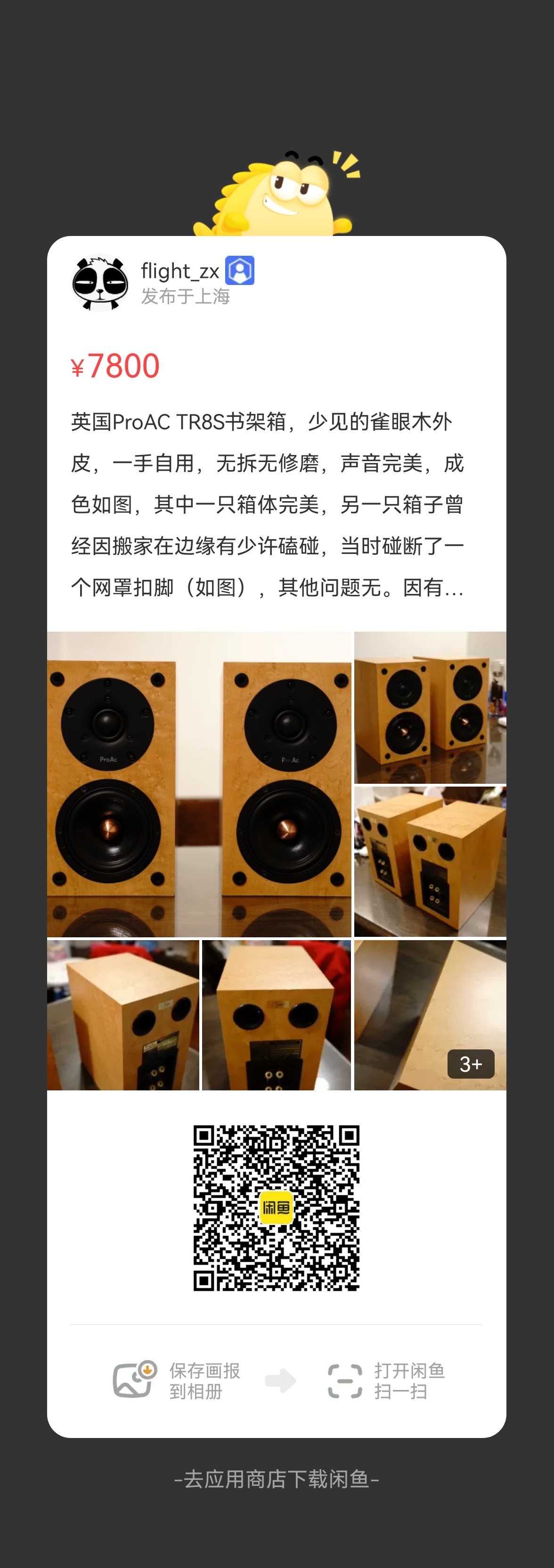 英国ProAC TR8S书架箱,少见的雀眼木外皮,一手自用,无拆无修磨,声音完美,成色如图,其中一只箱体完美,另一只箱子曾经因搬家在边缘有少许磕碰,当时碰断了一个网罩扣脚(如图,仍可固定不影响使用且装上后外观无异),其他问题无。因有瑕疵价格低于市场价,不接刀。无箱说包装,上海本地优先,不包邮,外地打包费及运费自理。