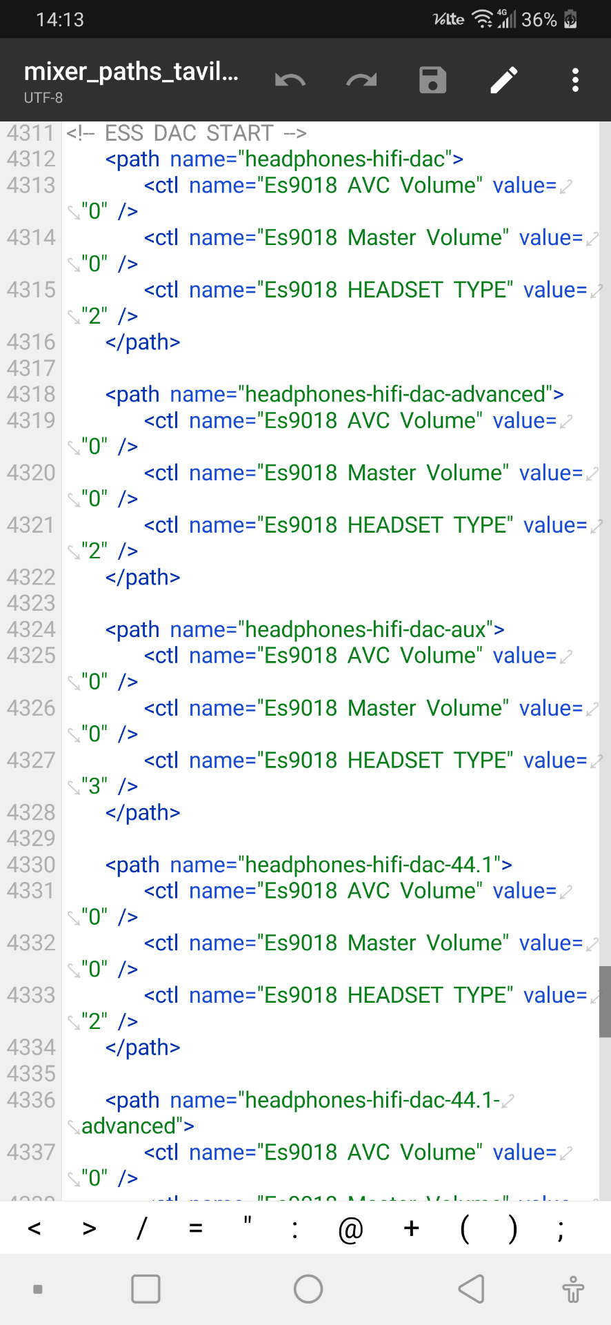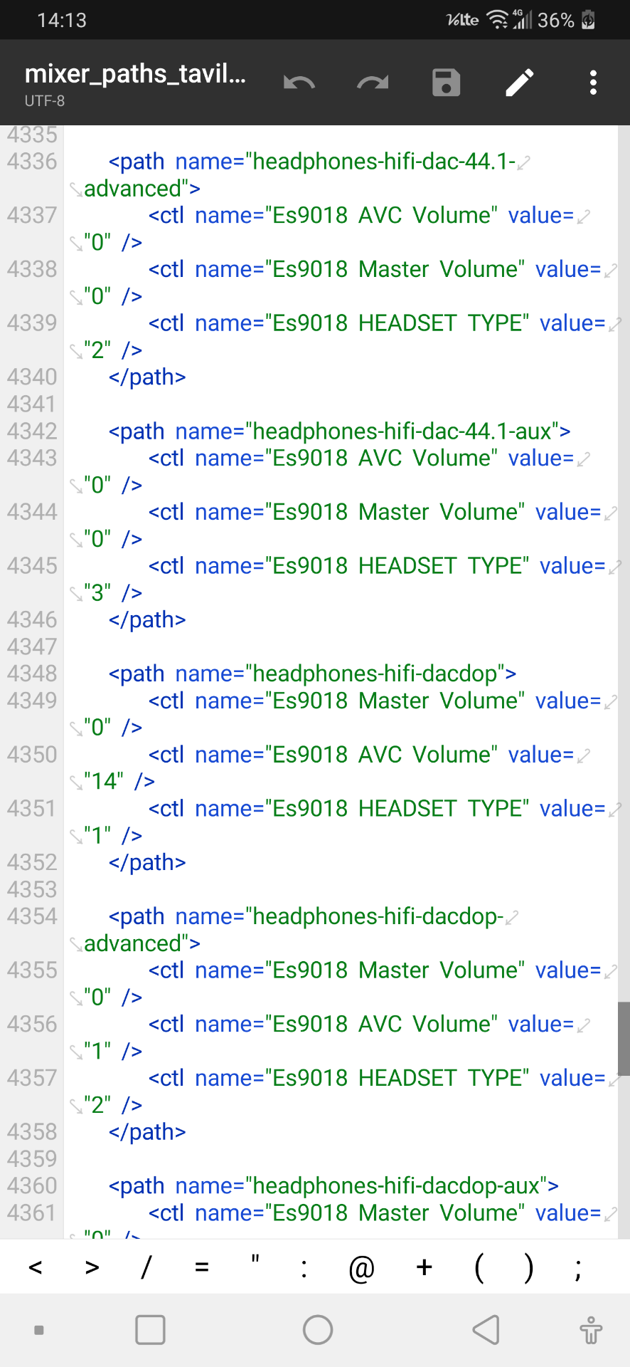 点击根目录,找到vendor,进去找etc,往下划找到mixer paths tavil xml,点进去使劲往下滑,大约到4000几,然后找到ESS DAC,把上面的数字改成我图片这几个,然后保存退出,重启手机,就是高阻抗模式了,戴上耳机试一下声音变大了就是成功了。