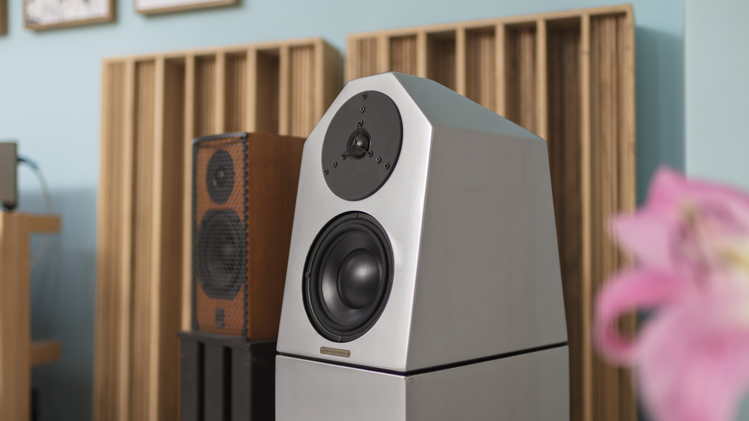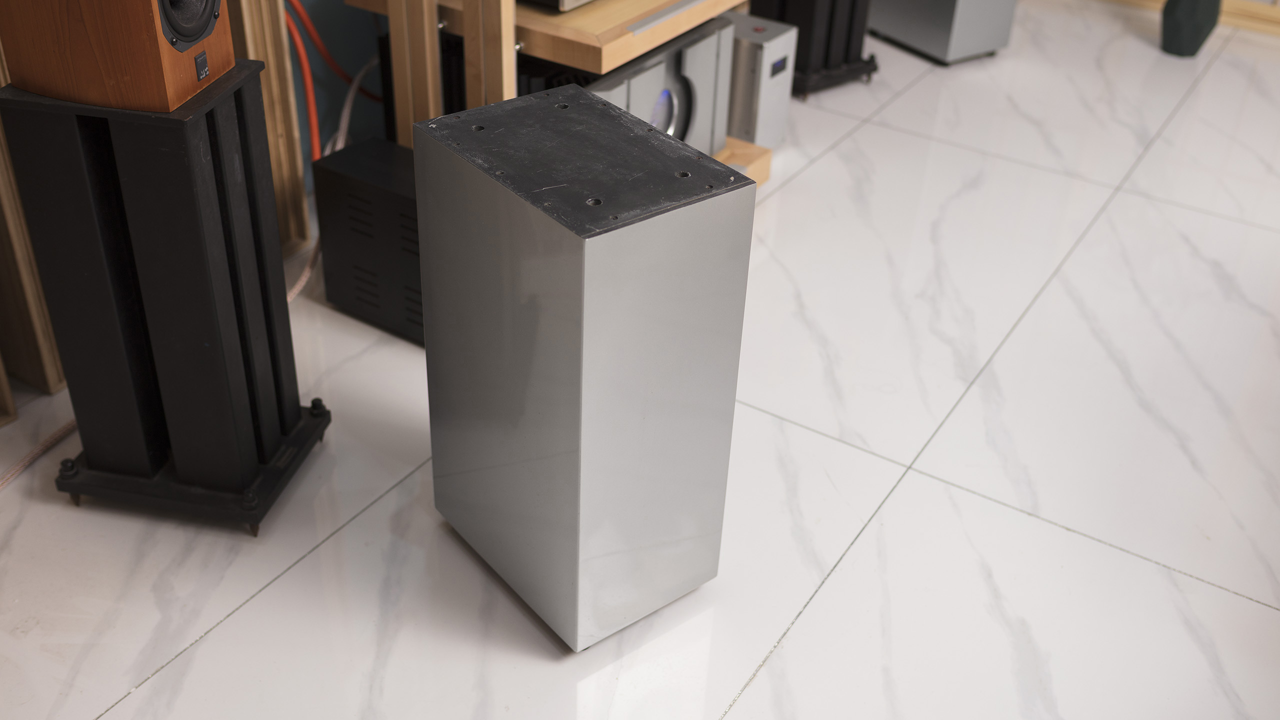 这是把伊莎贝拉上半截拿下来的样子,可以看到它比ATC SCM7要大上许多,而且外形也是不规则的多面体,有着非常摩登的现代设计气息。从顶上拍摄的角度可以看到它采用了钻石切割的方式,是特殊的9面体,除了箱底和顶部之外,另外7个面互不平行,这样就可以大幅度降低箱内驻波产生的几率。前障板略微倾斜,可以更好地修正高低音的相位。当然做得更加极致的应该是劲浪的箱子,比如说迈诗通的高音是向下倾斜,而低音是向上倾斜的。