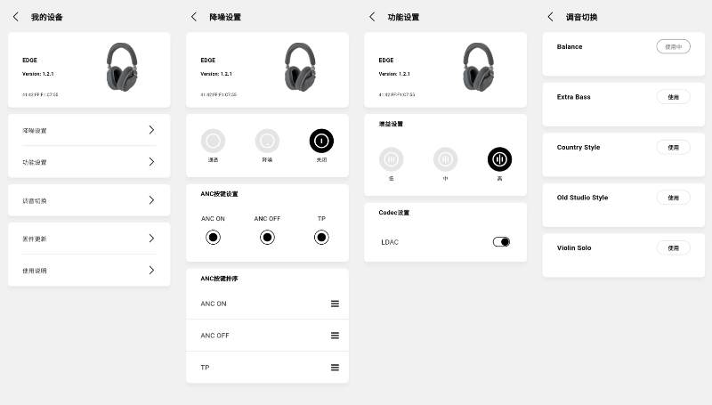 依旧靠谱的降噪部分说完,聊聊耳机本身核心功能,也即声音表现部分,还是老生常谈,数码品牌做降噪功能也许擅长,但说到HiFi音质的调音把控或技术实现,也是难题。所以我觉得HiFi品牌去加强降噪功能,做出功能不输平均水准,或小胜略赢,但声音依旧保持HiFi品质的降噪耳机,似乎是赢面更大的选择,毕竟现在消费数码品类的竞争实在是太激烈,没有自己的沉淀护城河,就很难做。 如上文所言Edge采用40mm大尺寸振膜,物理层面一寸长一寸强,搭配靠谱的高效驱动方案设计,整体动态效果再无线耳机当中还是相当不错,声场也未感挤压,还是可以打得开,听的宽松舒适。在低频下潜部分,下载APP选择LDAC高增益原配默认声音风格之下的表现,我觉得是比较可以的,回弹速度适中,整体量感不算多么臃肿,恰到好处吧,质感是比较加分的。人声没有过多染色,比较中性,位置合理,结象清楚,口型清晰,密度扎实,不虚不飘,最重要的,没有那种消费数码产品常见的涂抹感,你是能真切扎实的听清楚歌者的一字一句。