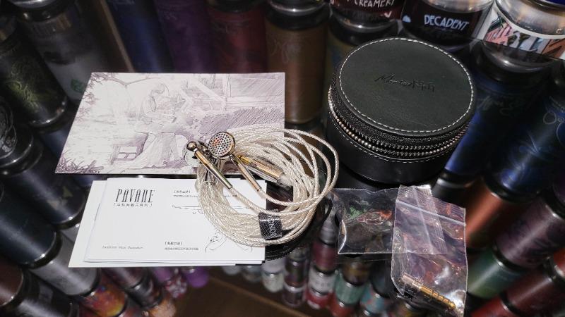 具体到最新发布的帕凡舞曲,初上手依旧是家族封面手绘,对应经典乐章的情景,完好的把老婆画的极致唯美吸睛。内盒收纳妥当,特别为保障耳机本体光洁无暇,多角度大量使用覆膜包裹,艺术品般呵护,开箱过程也很有仪式感,稳定发挥~ 配件部分是经典的皮质收纳盒与各类说明。尽管帕凡舞曲也如水月雨其他平头塞一样,在技术设计层面已具备不套海绵也可达到良好声音效果的能力,出于对可能存在的佩戴调整或音色微调需求,帕凡舞曲还是给配了多对空心海绵套作为附送。耳机线材质采用高颜值Litz结构单晶铜镀银设计,依旧是不可换线,但尾插部分可以通过旋钮金属套管,拔插更换3.5mm单端或4.4mm平衡插头,以方便搭配不同前端器材,满足不同需求,工艺细节处理的很好,不说我还真没发现。