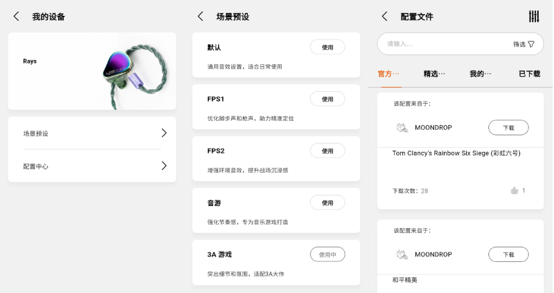 自带多种场景预设,可在APP中进行切换,默认音效下,依旧是水月雨专注音质表达的类似配置产品应有的高性价比专业解析之声,三频比较均衡,低频量不缺,人声密度扎实,乐器大场面解析清楚,音色还原取向也以真实自然为主,没有过多染色。如果你使用Rays光束日常听歌,也是不错的选择,所以我前面才说该款对于既玩游戏又听歌,有两份音质追求的朋友们来说,是双厨狂喜的存在。